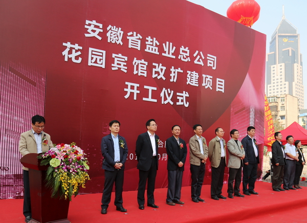 2014年10月18日上午,安徽省花園賓館改擴(kuò)建項(xiàng)目在花園賓館舉行隆重的開(kāi)工奠基儀式,參加儀式的嘉賓有:中共廬陽(yáng)區(qū)委書(shū)記吳勁、副書(shū)記張家祥,廬陽(yáng)區(qū)副區(qū)長(zhǎng)李仲生、中建八局四公司董事長(zhǎng)周可璋及相關(guān)協(xié)作單位、省鹽業(yè)總公司總經(jīng)理詹先豪,副總經(jīng)理王良貴、顏?zhàn)谌A、楊曉彬,省公司本部機(jī)關(guān)處室及直屬公司主要負(fù)責(zé)人。